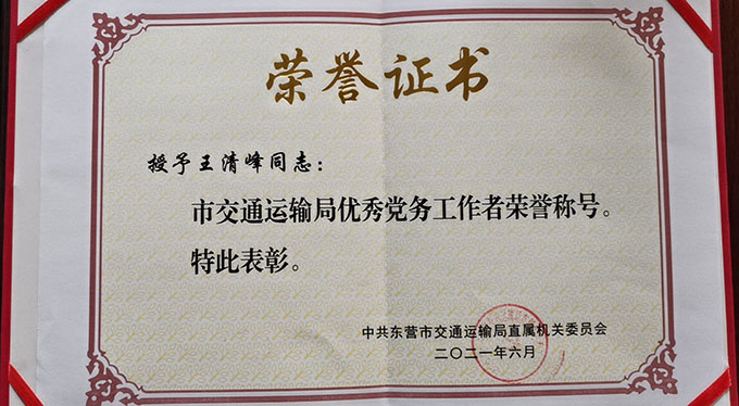 王清峰榮獲“市交通運輸局優(yōu)秀黨務工作者”
