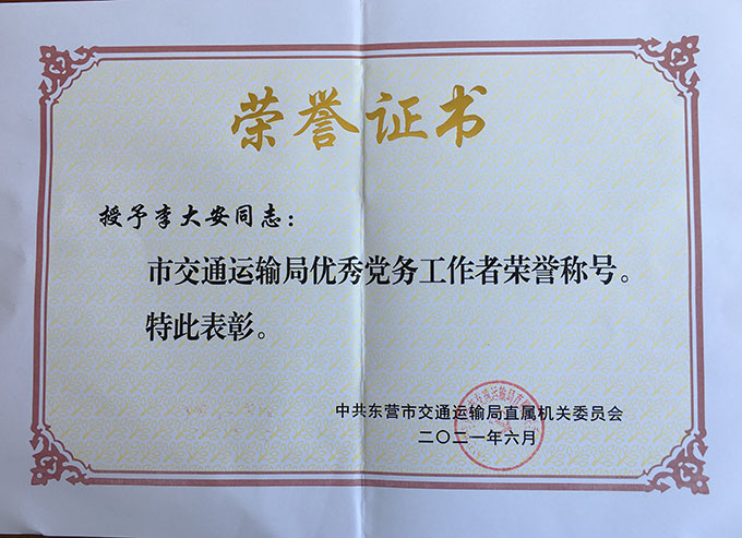 李大安榮獲“市交通運輸局優(yōu)秀黨務工作者”